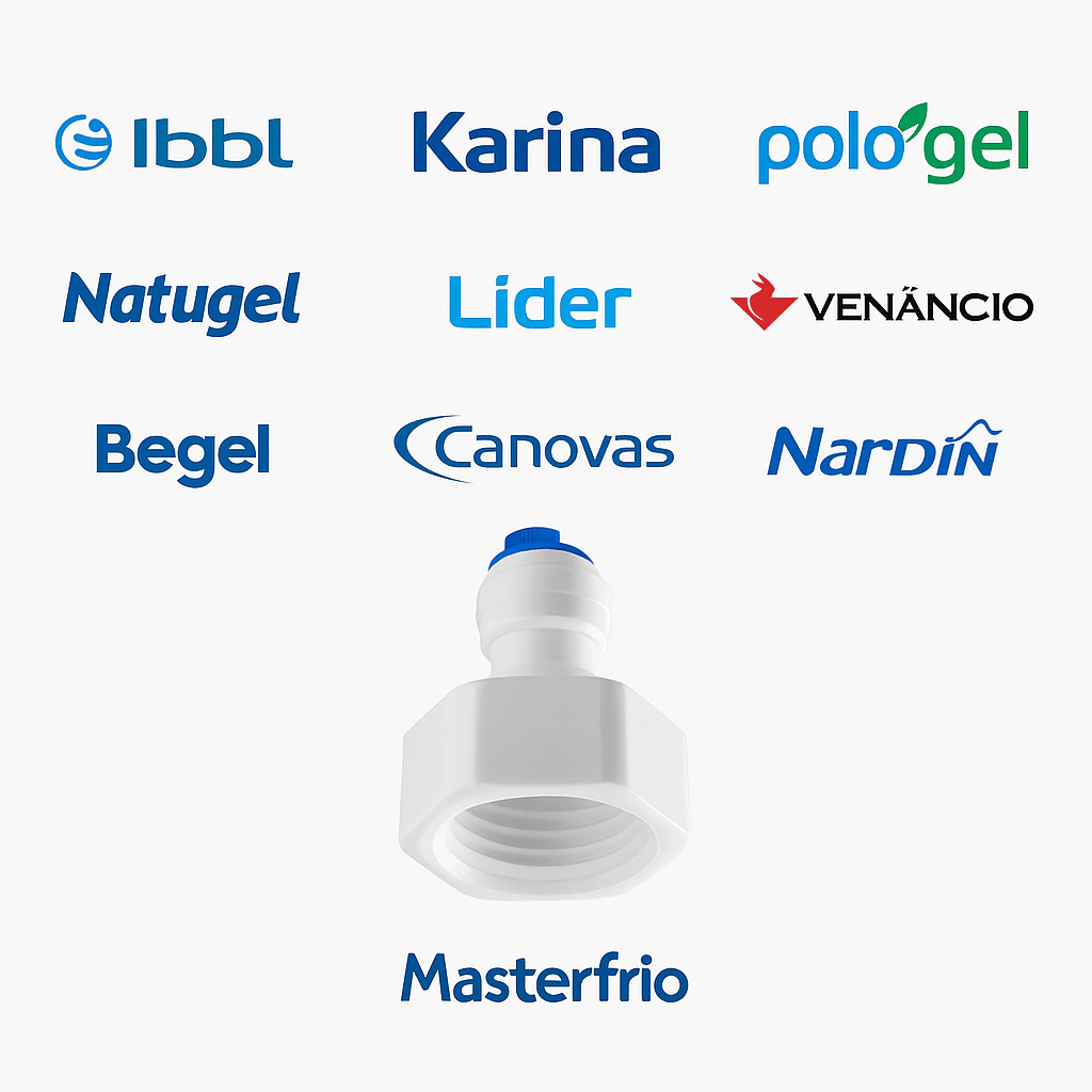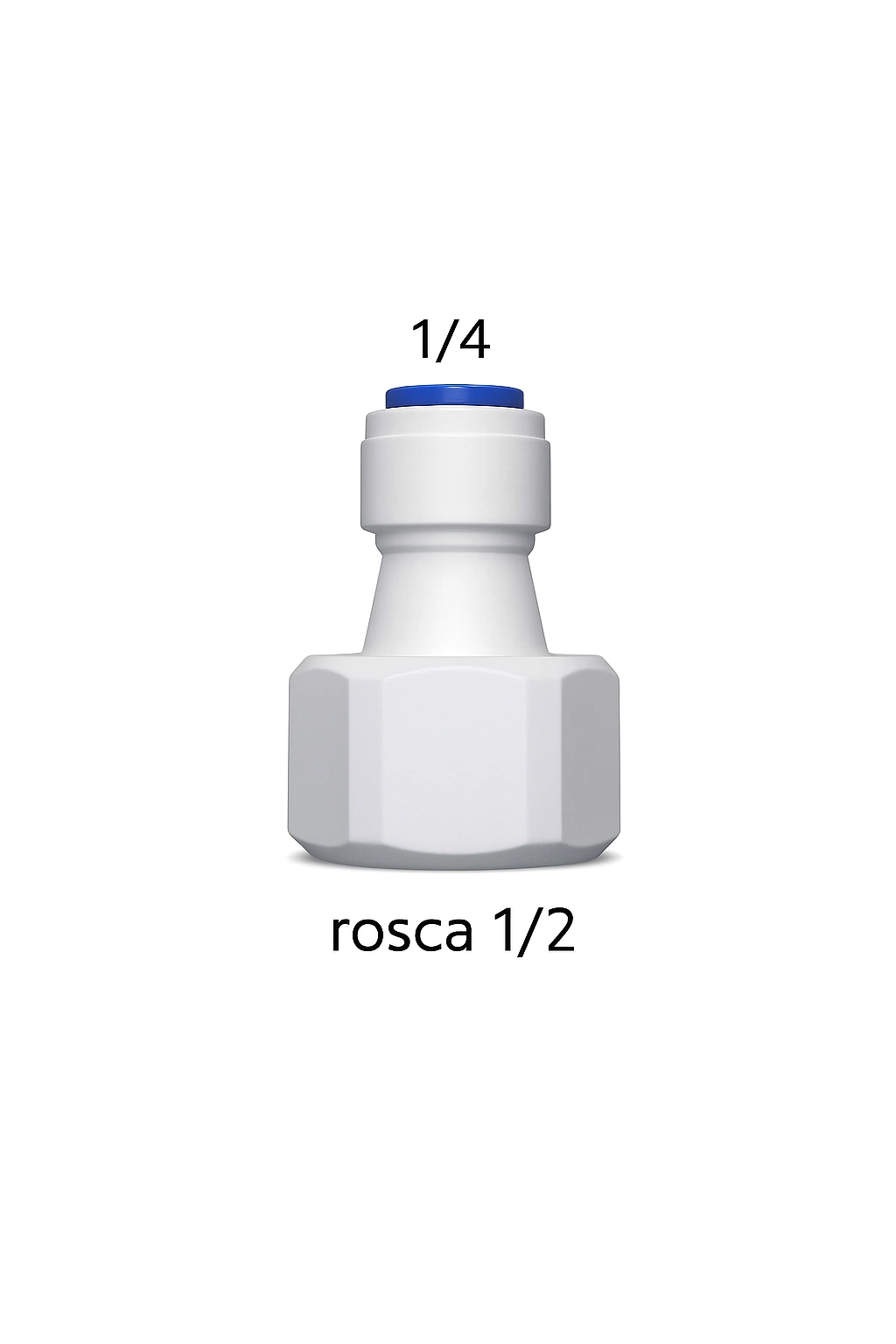 Conector para torneira com rosca fêmea 1/2" BSP e saída para mangueira 1/4". Ideal para filtros de água, purificadores e bebedouros. Fácil instalação, vedação segura e compatível com marcas como Ibbl, Karina e Masterfrio.