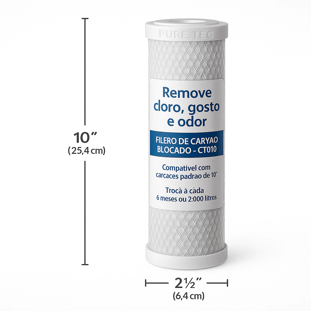 Tenha água mais pura, segura e sem gosto de cloro com o Cartucho de Carvão Ativado Blocado Puretec CTO10 Com 5 micras de retenção e certificação NSF, este filtro é ideal para sistemas de purificação residencial e comercial leve.